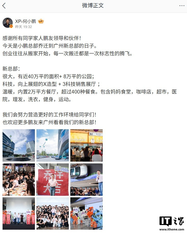 小鹏汽车10月21日宣布新总部在广州正式启用,“新总部乔迁,是新起点,是新征程。”何小鹏透露,小鹏新总部有近40万平的面积+8万平的公园,向上展翅的X造型+3科技销售展厅,内置2万平方餐厅,超过400种餐食。包含妈妈食堂,咖啡店,超市,医院,理发,洗衣,健身,运动。