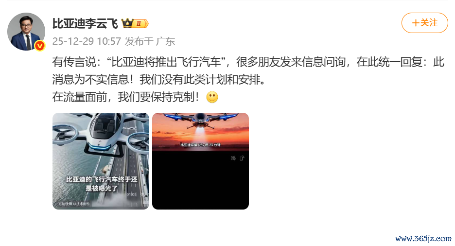 比亚迪李云飞:公司没有“推出飞行汽车”的计划和安排比亚迪李云飞:公司没有“推出飞行汽车”的计划和安排