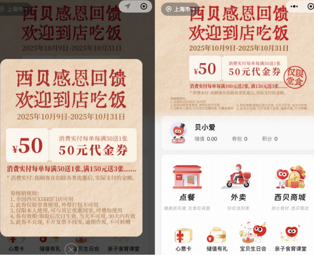 值得注意的是,代金券的获取门槛设定为“实付金额满50元”,也就是说,要想获得代金券,需要不断在西贝进行消费。